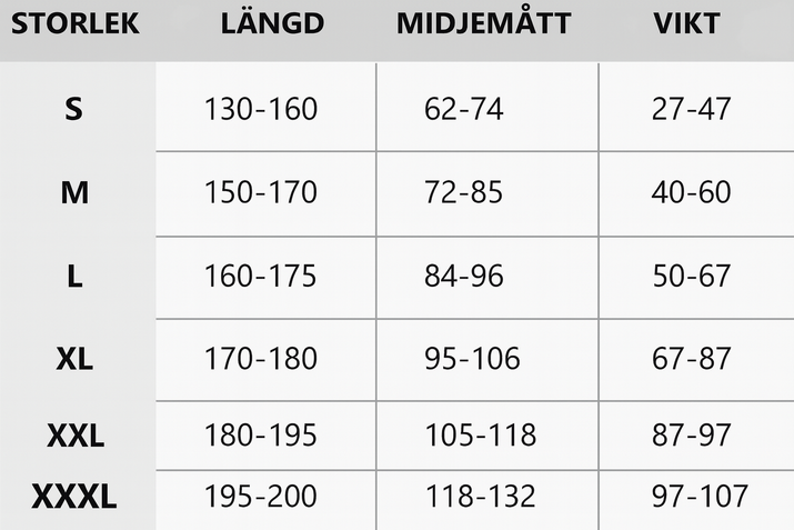 Storleksguiden är till för att du ska välja storleken som passar dig. Men oroa dig inte om du inte passar in i alla tre kategorierna! Det är endast riktlinjer så välj den som du tror kommer passa dig bäst!